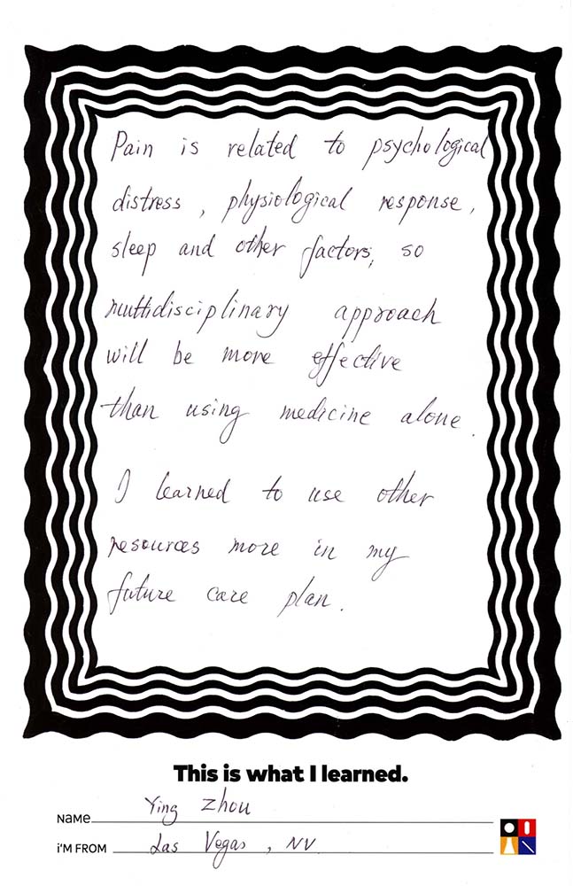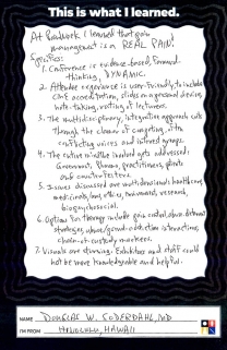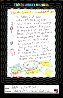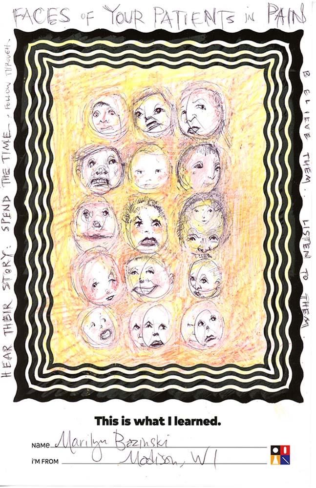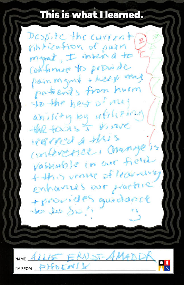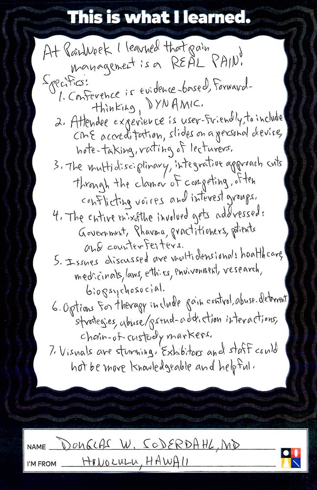We invite our registered attendees to record their impressions of the conference experience, using mini-canvases then posted on The PAINWeek Wall. Many of our attendees leave their mark in entertaining and creative ways. We think you'll be as impressed as we are by the artistic side of our dedicated practitioners!